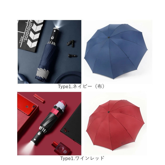 LEDライト 完全遮光 UVカット ストラップ付 自動開閉 折りたたみ傘 折り畳み傘 10本骨
